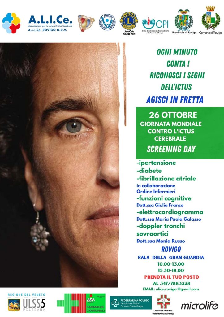 Rovigo – Si è conclusa con un grande successo di partecipazione la giornata di Screening Day organizzata in occasione della Giornata Mondiale contro l’Ictus Cerebrale (29 ottobre), promossa dall’Associazione per la Lotta all’Ictus Cerebrale (A.L.I.Ce. Rovigo O.D.V.) con la collaborazione anche dell’Ordine delle Professioni Infermieristiche (OPI) di Rovigo e il patrocinio delle istituzioni locali e dell’ULSS 5 Polesana. L’evento, tenuto nella Sala della Gran Guardia a Rovigo nell’intera giornata di domenica 26 ottobre, ha visto l’impegno diretto degli infermieri per offrire alla cittadinanza una preziosa opportunità di controllo dei principali fattori di rischio, invitandola ad eventuali ulteriori approfondimenti medici attraverso gli screening per l’ipertensione, il diabete e la fibrillazione atriale con elettrocardiogramma cardiaco ed eco color doppler dei tronchi sovraortici.
